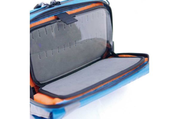 Si la destripamos encontramos un bolsillo principal donde entra perfectamente una caja 3010. Otro bolsillo y otra organización. Dos planchas de uretano separadas por un plástico transparente, organizan anzuelos y cabezas plomadas.