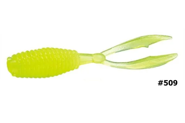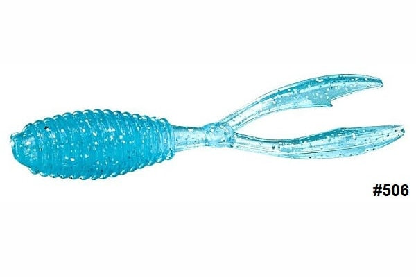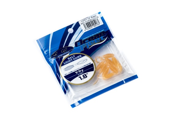 El señuelo de vinilo V-Fry de Evergreen quiere reproducir un pequeño crustáceo o un alevín de un pez y se emplea en las técnicas de pesca más livianas como Ajing y Rockfishing.